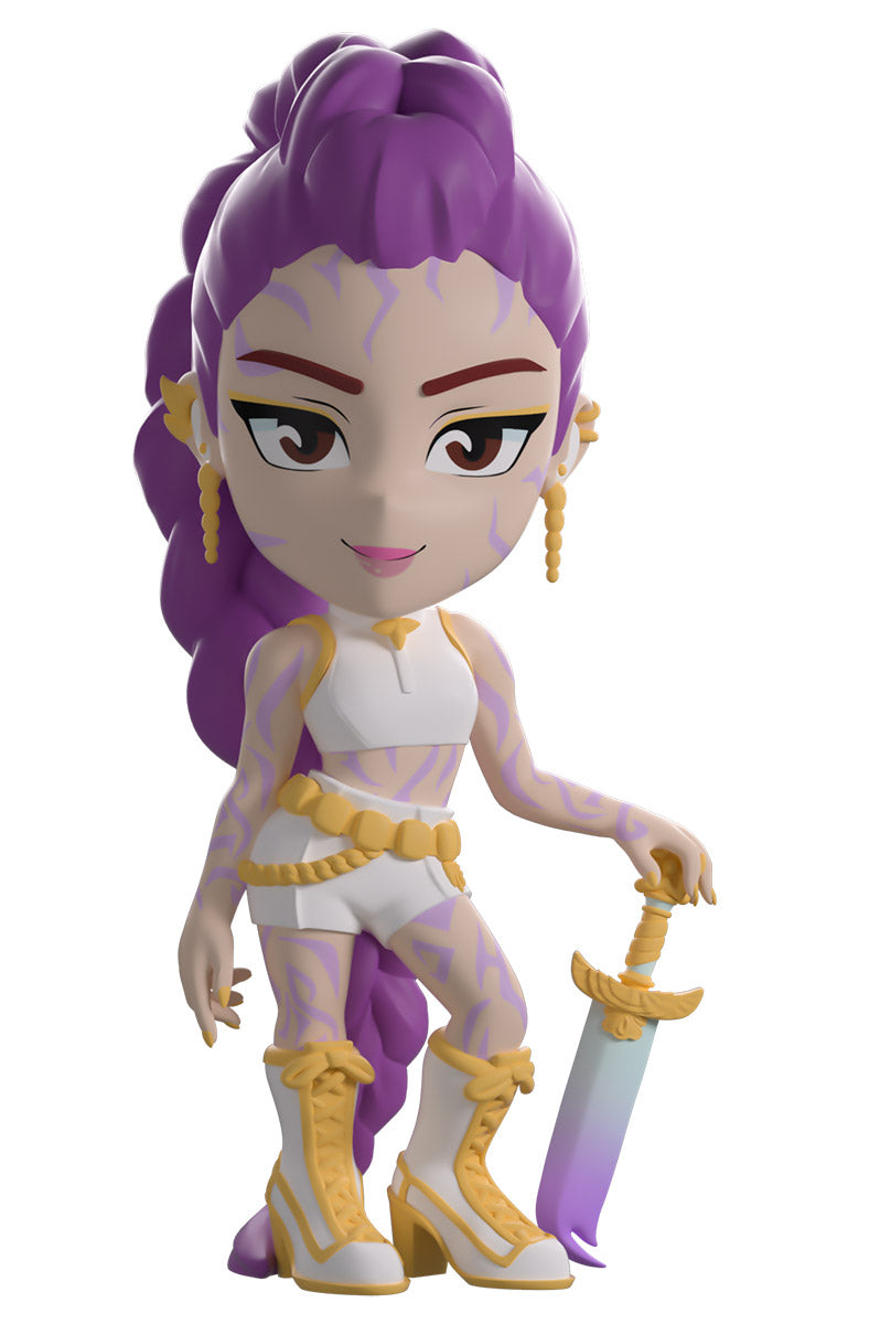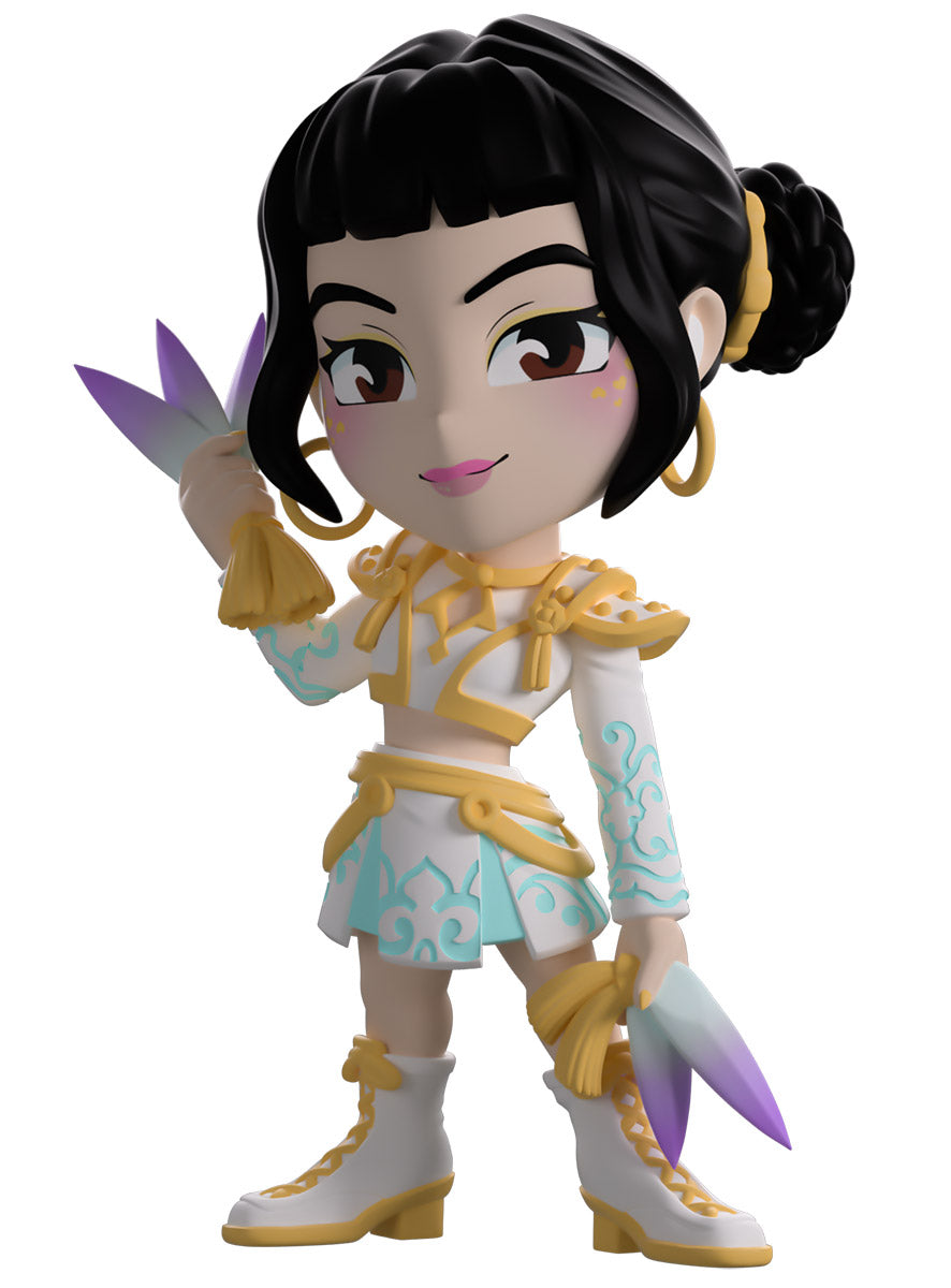 Each hand grips three purple-tipped daggers, a confident smirk playing at the corners of her lips. Short black hair with a straight fringe falls across her forehead, while longer locks cascade down either side of her heart-shaped cheeks. The remainder is pulled back into two tight braids at the nape of her neck. She wears a white long-sleeved top adorned with golden patterns across the chest and shoulders, complementing the waistband of her short skirt. Her sleeves featured a gradient pattern of pale purple and blue, while her feet were clad in ankle-strap platform boots.