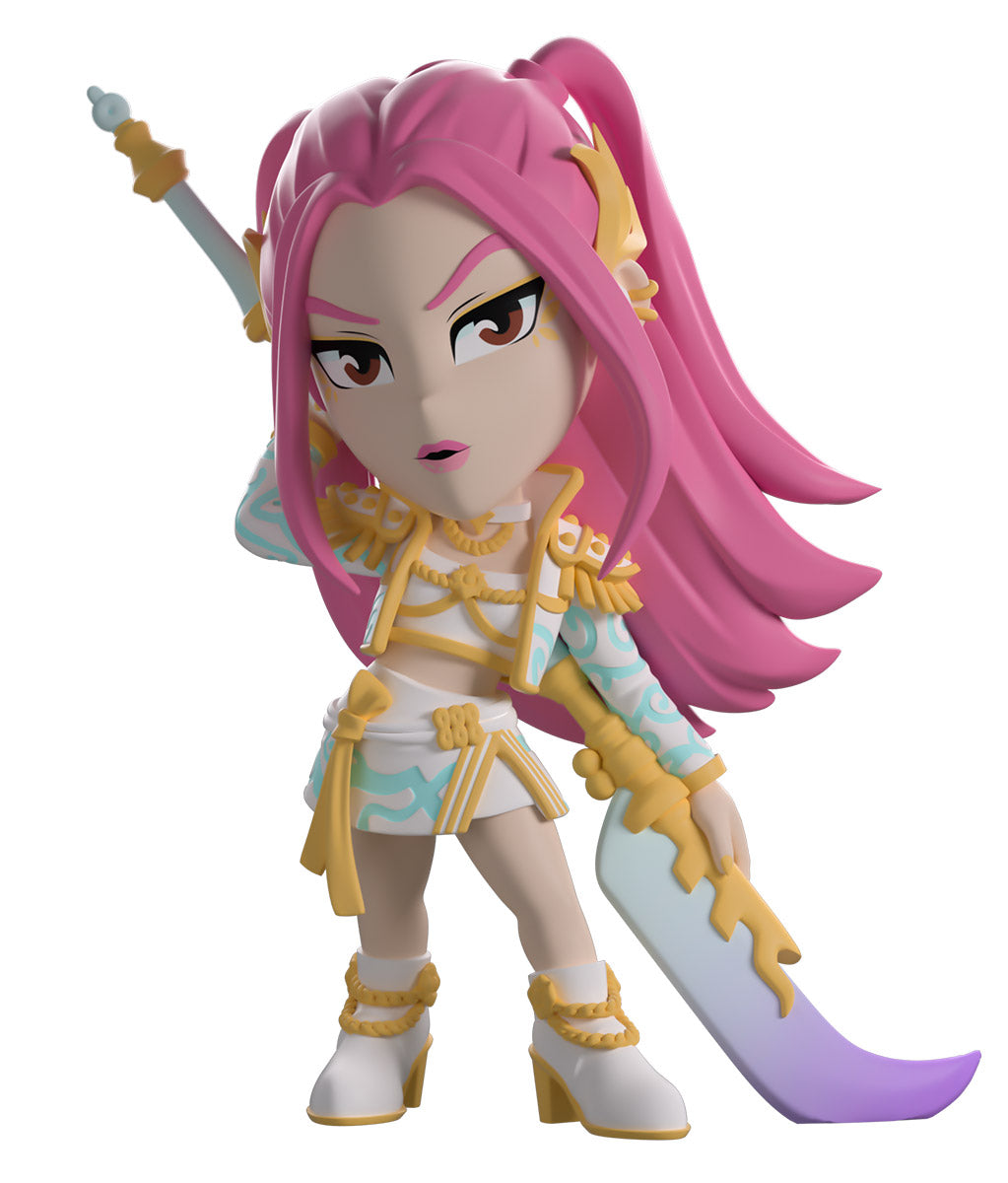 She struck a cool pose, slinging a long-handled gok knife diagonally across her shoulder. Gripping both hilt and blade tightly, her lips parted slightly. Pink bangs parted down the middle, framing her face and brushing lightly over her shoulders. She wore a gold-trimmed white coat over a simple vest and skirt, with faint purple-blue patterns emerging at the cuffs. Thick-soled ankle boots adorned her feet.